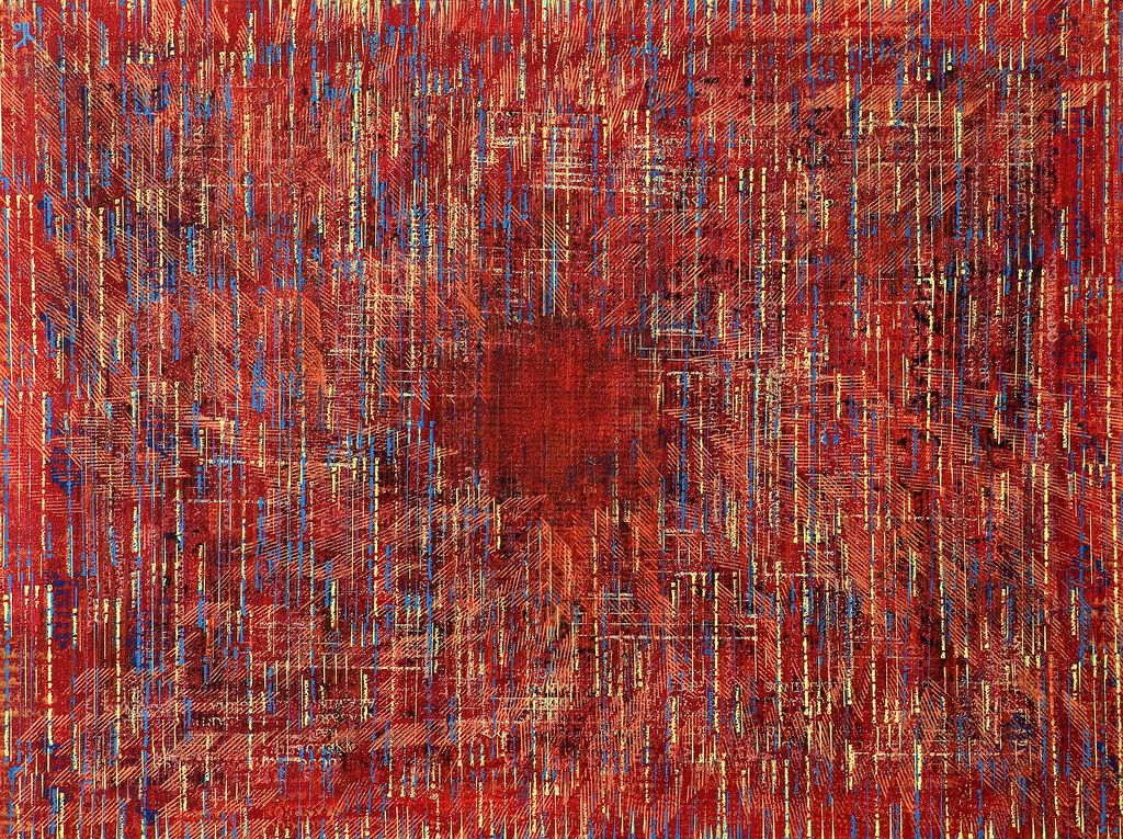 It is nourished with the freedom of mail art, with its artiststamp and visual poetry; the net-art and ASCII; the digital world , working with layers and transparencies, and the use of some solutions from engraving techniques. I search for space, the chromatic adventure and expressed by the weaving structures.